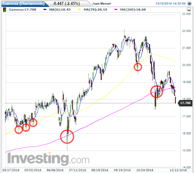 Como vemos la media móvil de 70 sesiones y la de 200 hace de soporte en varios puntos, sin embargo, la media móvil de 6 sesiones hace de soporte constantemente mientras la tendencia es alcista. Actualmente la cotización ha roto el soporte de la media móvil de 200 sesiones lo que nos podría indicar que el valor va a continuar bajando y lo que antes era un soporte ahora será una resistencia.